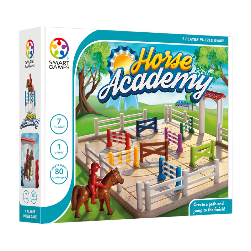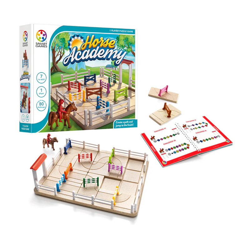 Horse Academy dezvoltă abilități esențiale precum concentrarea, gândirea strategică, coordonarea spațială și perseverența. Jocul este realizat din materiale de calitate superioară și are un design atractiv, specific jocurilor Smart Games.